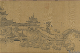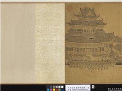 王振鹏(约西元一二八○—一三二九年),浙江永嘉人,字朋梅,元仁宗赐号孤云处士。任秘书监典簿,累迁至漕运千户,以界画名闻於世。此卷绘《东京梦华录》卷七所载北宋清明节时皇帝驾临开封金明池,观看诸军杂乐百戏与龙舟竞渡等活动。据卷末署款,绘於元武宗至大三年(1310),王氏用细密繁复的线条勾画宫殿楼阁、大小龙船,同时也绘制热闹的杂乐百戏等民俗活动,是为元代界画之精品。(20100101)