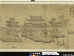 王振鹏(约西元一二八○—一三二九年),浙江永嘉人,字朋梅,元仁宗赐号孤云处士。任秘书监典簿,累迁至漕运千户。 本幅绘宋徽宗崇宁年间(一一○二—一一○六)三月三日开放金明池,举行龙舟竞渡,皇帝与民同乐操演水军的情形。画中楼阁亭宇,人物配置,景物安排,无一处松懈。王氏运用水墨白描法,以纤细繁密墨线作画,精彩的界画技艺令人叹为观止。此图作於至治癸亥(一三二三)。