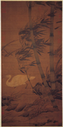 崔白(活动於11世纪後半),字子西,濠梁(今安徽凤阳)人。仁宗时画院艺学。道释、人物、禽兽、花卉无不精绝。 本幅画翠竹、水草随风摇曳,水波亦起伏荡漾。白鹭则逆向涉水,低姿迎风,饶富动态之趣。作者以挺劲有力的笔触钩画竹竿、竹叶和芦苇,用细若游丝的线条钩勒白鹭的轮廓,且仔细地丝出白鹭的羽毛。从画风来看,此画虽与崔白不类,但绘制精谨细腻,可能为南宋画家所为。 (20110913)