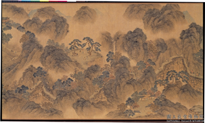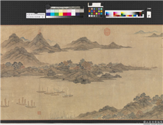 此卷自左向右展开,描绘长江两岸的风光。或画江面辽阔,远岸浮天;又时作远山叠幛,峰峦迭起。岸边还有城关、村舍、寺塔错落其间,构图疏密变化多端。幅末虽有王蒙的款印,作者也以细密的短披麻皴画石,山头又有繁密的苔点攒聚,试图营造王蒙(西元一三○八—一三八五年)画作中常见的草木蓊郁的意象。可是全作的笔法板滞,墨色缺乏层次变化,应是一件後人伪托王蒙之名的作品。