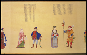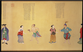 宋人史绳祖着《学斋占毕》引李公麟语云:「梁元帝时,萧绎镇荆时作贡职图,状其形,而识其土俗,首虏而後蜑,凡三十余国。」贡职图即职贡图,「职」即职方,是古代官名,职贡即职方贡物。《周礼˙夏官》有职方氏,掌天下地图,主四方职贡。我国历代以来,边疆民族及属邦与中央的关系,日益密切,职贡有图,方物有录,所谓职贡图,其实就是我国边疆民族及外邦属国的民俗图像。 国立故宫博物院典藏「职贡图」,乾隆年间谢遂绘制,共