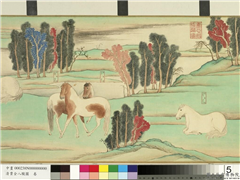 乾隆四十一年(西元一七七六年)冬月。臣贾全奉勅恭绘八骏图。仿金廷标橅李公麟法画爱乌罕四骏图笔意。赵孟頫饮马图地坡。赵雍仿宋人十八拍图山树法。