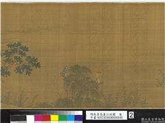 本幅以一渔父为开端,越过岸边的山脉巨石後,进入一个安和乐利的聚落。聚落中各种野花盛开,文士们或读书,或饮茶对谈,或倚榻乘凉等,其余则渔夫捕鱼,童仆洒扫、备茶,儿童们下棋,小狗跳跃等,全幅充满各种生活细节的描绘。此种对於细节多样性的活泼呈现确为仇英风格,然笔法稍弱,应为後人仿作。本幅的构图设计、内容与青绿的使用,整体呈现出桃花源的意象。(20100710)
