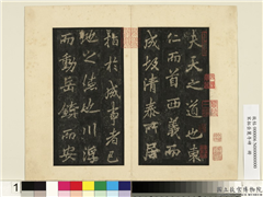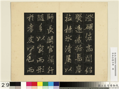 (墨搨李邕书岳麓寺碑二百六行。)夫天之道也。东仁而首。西义而成。故清泰所居。指於成事者已。地之德也。川浮而动。岳镇而安。故耆□(闍)所□(临)。取於安定者己。兹寺大柢。厥旨玄同。是以回向度门。躔于郭右。仰止浄域。列乎岩巅。宝堂岌嶪於太虚。道树森捎於曾渚。无风而林壑肃穆。不月而相事澄明。化城未真。梵天犹俗。名称殆绝。地位尝高者。不其盛欤。麓山寺者。晋太始四年之所立也。有若法崇禅师者。振锡江左。除结与