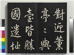 敬胜斋法帖第三。(隶书)。御制宝月楼记。(楷书)。文有神会。落笔可以千言。兴有时来。待机不妨数岁。宝月楼记之作。迟速盖有如是。宝月楼者。介於瀛台南岸适中。北对迎薰亭。亭与台皆胜国遗址。岁时修葺增减。无大营造。顾液池南岸。逼近皇城。长以二百丈计。濶以四丈计。地既狭。前朝未置宫室。每临台南望。嫌其直长鲜屏蔽。则命奉宸。既景既相。约之椓之。鸠工戊寅之春。落成是岁之秋。久欲为记。辄以片时来往。率即成咏罢辍