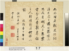 十一月日。金紫光禄大夫。检校。刑部尚书。上柱国。鲁郡开国公。颜真卿。谨奉书于右仆射。定襄郡王。郭公合下。盖太上有立德。其次有立功。是之谓不朽。抑又闻之。端揆者百寮之师长。诸侯王者人臣之极地。今仆射挺不朽之功业。当人臣之极地。岂不以才为世出。功冠一时。挫思明跋扈之师。抗回纥无厌之请。。故得身画凌烟之合。名藏太室之廷。不其吁足畏也。然美则美矣。而终之始难。故曰。满而不溢。所以长守富也。高而不危。所以长