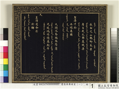 (汉满文楷书。)於铄皇清。受命於天。光延鸿祚。亿万斯年。天开令节。瑞启阶蓂。共球万国。圣寿千龄。粤自我先。肇基俄朵。长白之山。鹊衔朱果。绵绵瓜瓞。长发其祥。笃生列祖。积庆重光。式廓旧疆。东讫海表。圣圣相承。永世克绍。右第一章。赫赫神功。龙飞崛起。戎甲十三。奋迹伊始。复雠靖难。首克图伦。天戈一指。震慑强邻。九姓潜侵。灭迹如扫。蒙古五部。来奉大号。明师四路。五日而歼。定鼎辽渖。都城岩岩。
