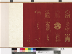 陆宗楷(生年不详,卒於西元一七七三年),浙江仁和人。雍正元年(一七二三)进士,乾隆时任国子监祭酒,官至兵部尚书。陆氏学识渊博,曾考证周礼、论语、孟子等书,参与史记等典籍之校刻。 本卷为清宫旧藏,以泥金书写一百二十种「寿」字於红绢上,包括诸体篆书及蒙古、西藏、托特与回文等,颇富图像趣味,用端正规矩的小楷标明各种书体。卷末题款「臣陆宗楷恭篆」,是为皇室贺寿之用。