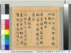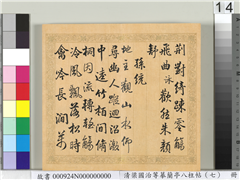 兰亭八柱帖。第七册。(隶书)。(小字注。董其昌仿柳公权书兰亭诗。)(楷书)。(第一则)王献之。四言诗并序。四言诗。王羲之为序。序行於代。故不录。其诗文多不可全载。今各裁其佳句而题之。亦古人断章之义也。(第二则)王羲之。(小字注。自此已下十一人兼有五言)。代谢鳞次。忽焉以周。欣此暮春。和气载柔。咏彼舞雩。异代同流。乃携齐好。散怀一丘。(第三则)谢安。伊昔先子。有怀春游。契慈玄执。寄教林丘。森森连岭。