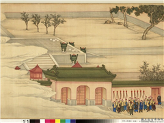 乾隆七年(西元一七四二年)仿古制建「蚕坛」,制定一套完整的「亲蚕礼」仪式,孝贤皇后於九年首先施行,以奖励农桑,并由郎世宁(一六八八-一七六六)等院画家合作绘制此〈亲蚕图〉,共计四幅,分别是诣坛、祭坛、采桑、献茧等不同的情节。此次展出第四卷〈献茧〉,画皇后坐殿上,诸王嫔妃跪进蚕茧的情形。卷首杨柳夹岸,绿树垂荫,色彩浓艳,具立体透视效果,为典型宫廷纪实画。(20120103)