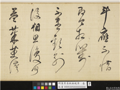 董其昌(西元一五五五-一六三六年),字玄宰,号香光、思翁,松江华亭人。万历十七年进士,天启年间官至南京礼部尚书,後请归故里,隐居以书画自娱。近景坡石间乔松、枯木及杂树林立,多以浓淡墨横点,树後露出几间屋宇。高峻山峦互叠,草木苍翠,对岸远山起伏连绵,遥接天际。山石绘法采披麻皴,并以水墨晕染,虽仿自黄公望、赵孟頫,仍具有率笔写意的董氏特色。