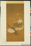 冰裂纹花瓶插饰折枝白梅,前置盆栽水仙。此轴为岁朝清供图,春节花仙赐福,象徵新春如意。另有松鼠戏瓶,嗑食撒落地面瓜子、核桃,增添画面生动热闹的气氛,图中瓜子、桃核又有「子孙和合」之吉祥含意。 本幅无名款,以各种吉庆物品组合,绘松鼠或为鼠年岁朝所作,整幅构图布局与院藏清无款〈乾隆缂丝岁朝图〉近似。(20110102)