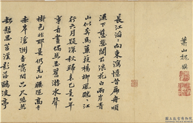 赵孟頫(西元一二五四—一三二二年),浙江吴兴人,字子昂,号松雪道人。本宋宗室,宋亡仕元,至翰林学士承旨,封魏国公,諡文敏。 赵孟頫山水,有师法董源者,笔墨简澹浑朴;有师法李成、郭熙者,笔墨清奇婉丽。此幅即是学李郭一路,用笔用墨,都极清婉奇突。全幅用淡墨起稿,逐层钩染提破,间有笔不掩墨处。五十岁(一三○三年)画。
