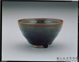 弇口碗,口沿外缘向内束收,深腹、小圈足。釉施不及底,旦露深褐色粗厚的器胎。足外壁无釉,足内则浅凹,并深刻一「律」字楷书。釉色鸟黑浓稠且流动性大,外壁垂淌至近足处,内底积厚釉,口缘则薄釉而形成特徵的「褐口边」。碗身里外均有结晶析出的青黄色细密线条,随釉流动,深茂相杂,宛如秋兔的毫毛,故宋人称之为「兔毫盏」。