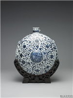 扁圆形壶,仿西域水囊造型,一面凸,另面平,小圆口,口旁有一圆系。以釉下青花绘饰,颈饰如意云头形纹;腹和侧边满布转枝番莲纹,腹中央突起圆形绘波涛纹。侧边贴饰花纹。青花艳丽,背面无施釉。附镂雕双龙抢珠红木座。